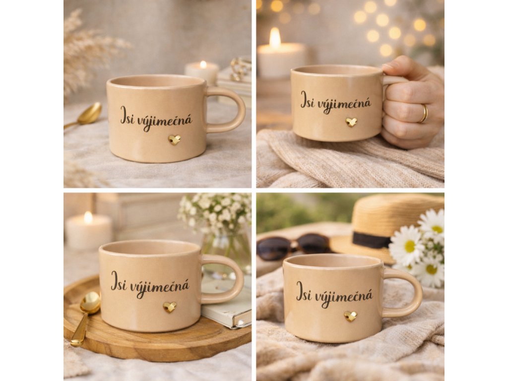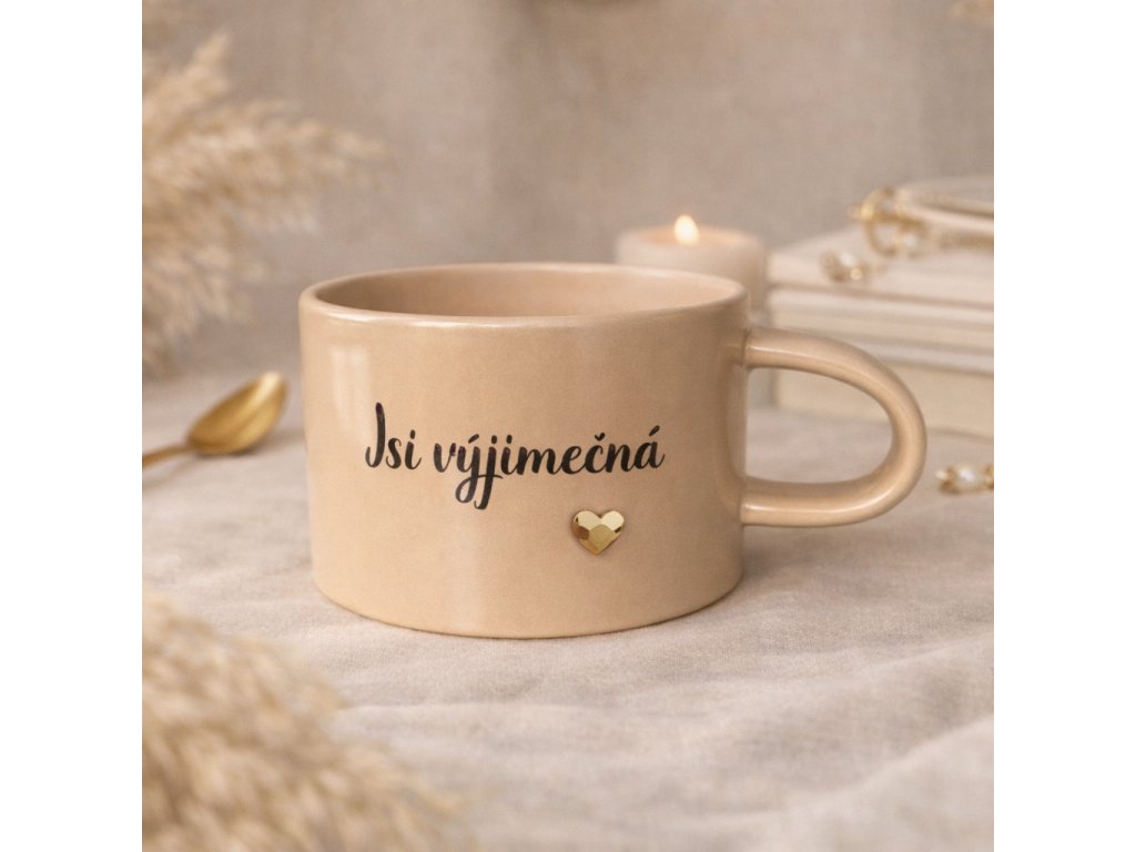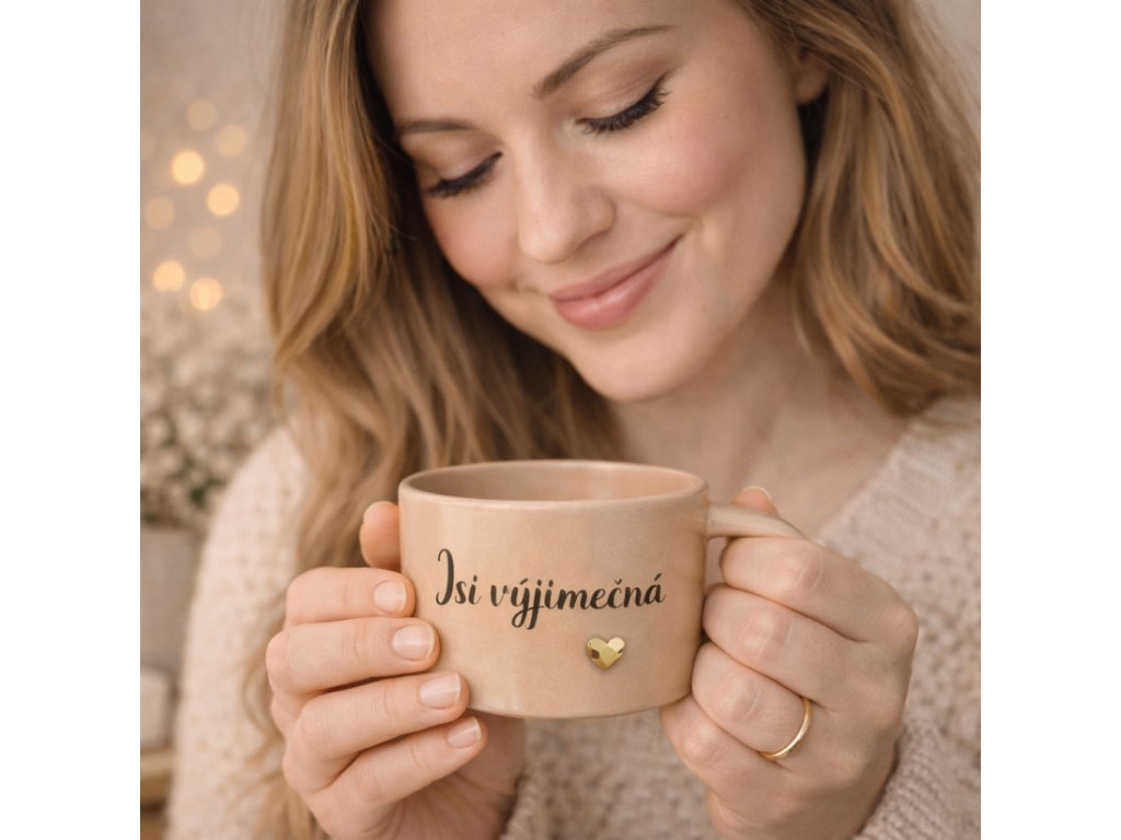 Hrnek ,,Jsi výjimečná” Jednoduchá věta, která má sílu potěšit. Minimalistický hrnek s jemným písmem a zlatým srdcem je malou každodenní připomínkou sebevědomí a laskavosti k...